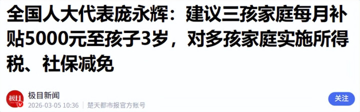 除此以外,他还建议对多孩家庭减免所得税、社保,刊行永恒育儿专项国债。