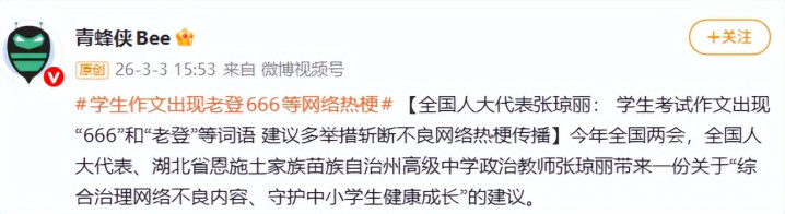 嘴里还动不动就冒出“老登”“666”,甚而把这些热梗写进磨真金不怕火作文里。
