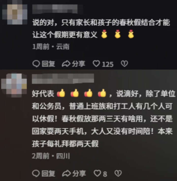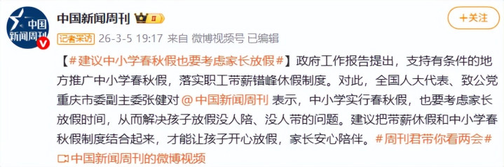 他奏凯建议,中小学的春秋假,要和家长的带薪年假统筹安排。
