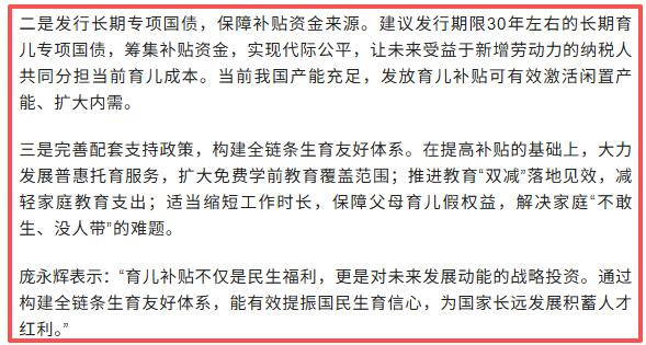 他建议大幅提高育儿补贴表率,一直补贴到孩子3岁。