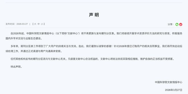 3月27日,中国科学院文件谍报中心发布声明:自2026年起,文件中心将不再更新与发布期刊分区表。咱们将络续开展学术资源评价设施的盘问与探索,开云体育(中国)官方网站积极做事国表里学术交流与出书生态斥地。针对2026年度已订购用户的有关合共事宜,杏彩官方网站咱们将尽快入手后续处单干作,并通过认真渠说念与用户雷同具体安排。任何其他机构发布的期刊分区表均与文件中心无关。凡侵害文件中心正当职权的,文件中心将照章依规摄取相应措施,赞佩本身的正直职权不受毁伤。