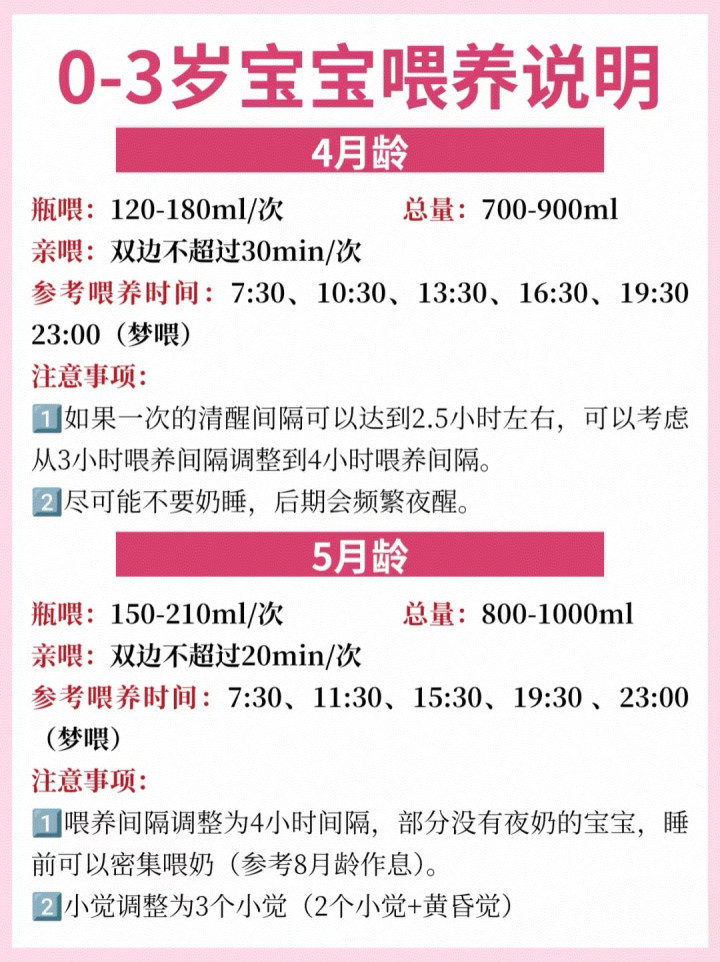 4个月后,宝宝融会远隔变长,不错尝试从3小时喂养过渡到4小时。5个月时,小觉调治为3次(2个小觉+薄暮觉),日间更精神。
