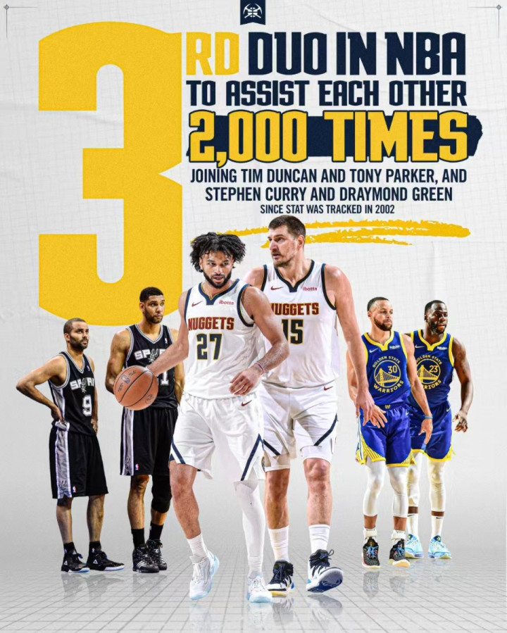 约基奇与穆雷彼此送出至少2000次助攻,成为历史第3对竣事该竖立组合,并排库里与追梦,邓肯与帕克。