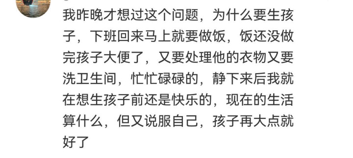 昨晚一边作念饭,一边反念念:为什么要生孩子?饭还没熟,杏彩官网孩子拉了孤单。一手科罚脏穿戴,一手刷卫生间,忙得脚不点地。静下来那一刻,我在想,孕珠前阿谁解放自得的我去哪了?咫尺的生计,到底算什么呢?[捂脸R] 但转头又劝我方:忍一忍,孩子再大点,就好了。