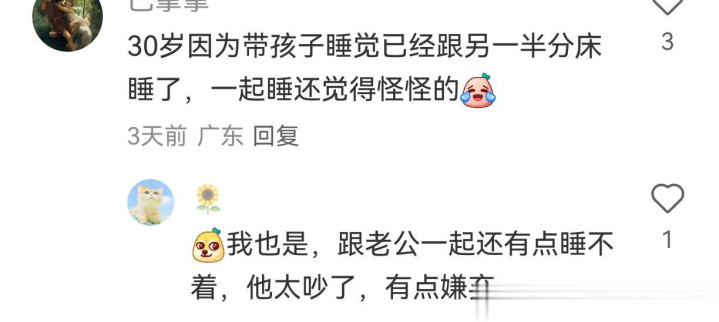 30岁,因为要陪孩子寝息,早就和老公分床了,咫尺偶尔一齐睡反倒认为怪怪的[笑哭R]。